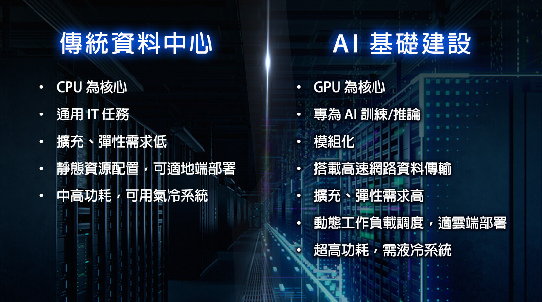 現代資料中心的角色,正隨著 AI 的崛起而快速轉變。過去,傳統資料中心是企業儲存與處理資料、支援虛擬化與業務應用的 IT 平台,多以 CPU 為核心建構,講求的是資訊安全穩定性、多核心擴充性與運作成本效益。然而,隨著企業開始廣泛部署機器學習與生成式 AI 技術,這樣的基礎設施已難以應付 AI 工作負載對高效能、低延遲與大規模資源動態調度的需求。