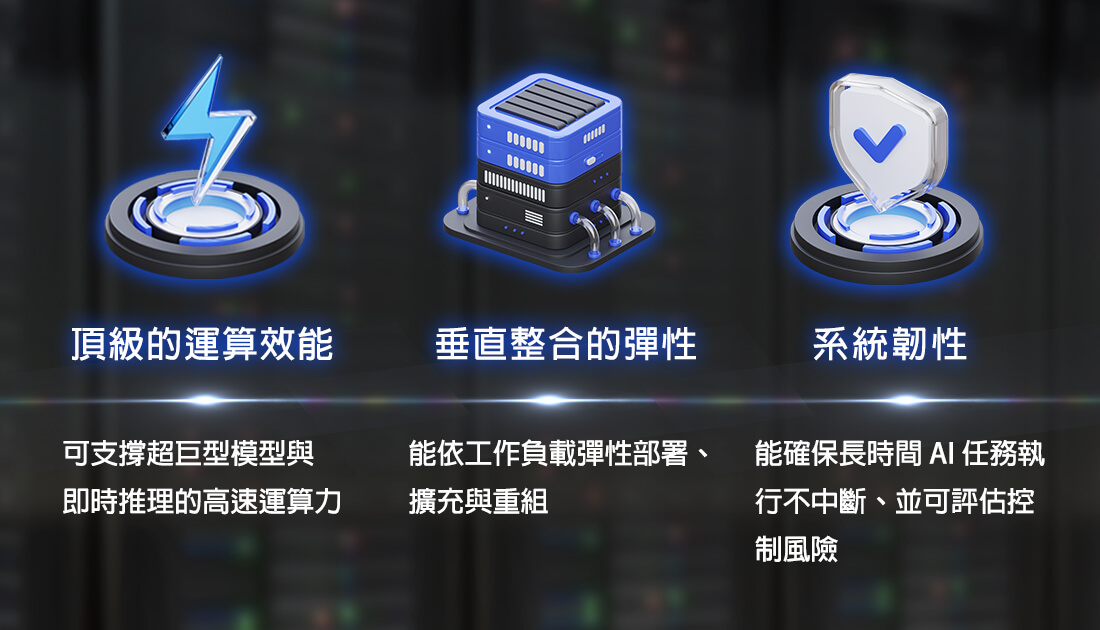 這場技術驅動的浪潮,為基礎建設帶來前所未有的挑戰。傳統架構難以滿足 AI 工作負載對高效能 GPU 密度、模組化擴充性,以及散熱與電力管理的要求。同時,AI 不僅在雲端訓練與部署,更向邊緣延伸,與終端使用場景緊密結合。這意味著資料中心不再是單點建設,而是需與邊緣節點與前端 AI 形成協作網路,實現資料的即時反應、運算與回饋。在這樣的條件下,AI Infrastructure 必須同時具備三項核心能力:頂級的運算效能(performance)、垂直整合的彈性(Flexibility)、與系統韌性(resilience)。只有滿足這些條件,資料中心才能真正承接 AI Factory 的重任,成為企業生成式 AI 的引擎核心。