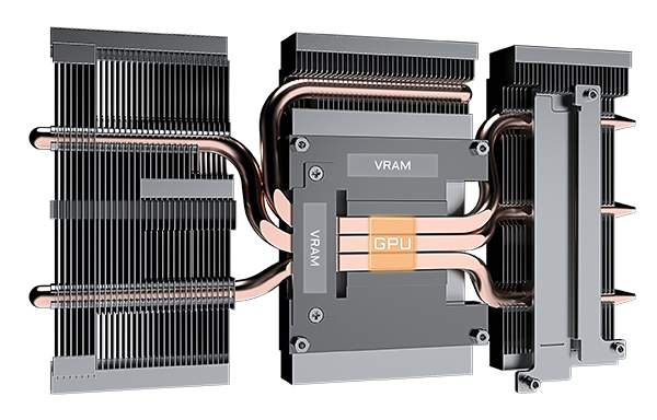 將高效能純銅熱導管打平塑型後直接接觸GPU表面,透過增加熱導管與GPU的直接接觸面積,可大幅提升GPU的熱源傳遞速度,同時透過覆蓋在VRAM上的金屬底板,銅熱導管也能幫助散熱。