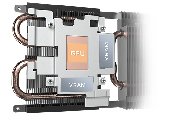 透過銅板直接與GPU接觸,並藉由複合式導熱管的高效導熱,迅速且有效地將GPU及記憶體的熱量傳遞至散熱鰭片。