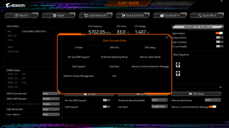 技嘉UC BIOS的Quick Access功能從進階模式中選擇9個實用的預設選項,並將它們輕鬆放在簡易模式中,無需切換或搜索即可輕鬆存取。
