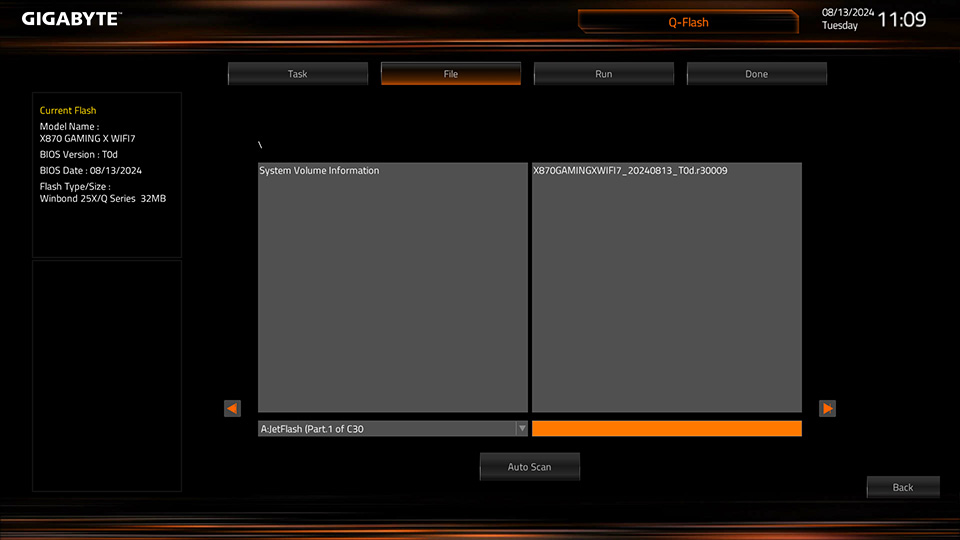 新的自動掃描功能在使用USB閃存驅動器進行Q-Flash時,BIOS文件將自動掃描,無需手動搜索。