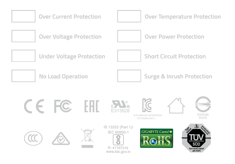 為了讓整個電腦系統能夠在任何狀況下都能穩定的運作,我們不但加入了OCP、OTP、OVP、OPP、UVP、SCP等保護設計,更通過各國的安規認證,來確保您的系統能夠穩定運作。