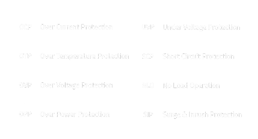 - 全方位電路保護機制: OVP / OPP / SCP / UVP / OCP / OTP / NLO / SIP