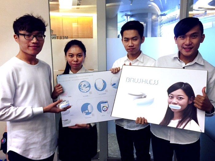 創新科技組銀賞由義守大學學生林崇旭、葉子謙、陳雲翰、郭佩誼設計的「Brushless」奪得。導入超音波洗淨概念,只要放入洗液就可以整口清潔,還可以隨身攜帶,讓刷牙更輕鬆、簡單。林崇旭說,當初會有此構想,是因為覺得刷牙很難真正刷乾淨,又很花時間,還只能在浴室刷。陳雲翰解釋,「Brushless」體積小、攜帶方便,只要裝入洗液膠囊、放入口中啟動電源,洗液就會注入口中,靠超音波技術清潔口腔。