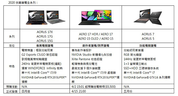 技嘉科技聯手國際 G2 Esports 電競戰隊,推出 AORUS 17X旗艦機皇與AORUS 17G、AORUS 15G高階電競筆電,從職業電競選手的需求打造出「專業電競筆電」。本次升級搭載包含可超頻Intel® Core™ i9-10980HK、Intel® Core™ i7-10875H及Intel® Core™ i7-10750H三款第十代處理器,其中最特別的i7-10875H是首款具備8核心、16執行續的i7行動處理器;顯示卡方面,除原有NVIDIA® GeForce RTX™ 20系列及GTX 16系列外,更新增新一代筆電卡皇NVIDIA® GeForce® RTX 2080 SUPER™及NVIDIA® GeForce® RTX 2070 SUPER™規格,預期在媒體處理速度及遊戲表現都能有所提升。