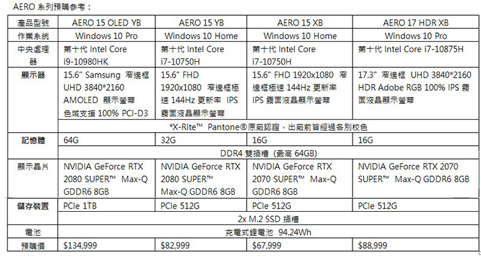 本次包含15吋AERO 15 OLED (支援4K解析度及HDR400)、AERO 15以及17吋AERO 17 HDR (支援4K解析度及HDR400)、AERO 17全系列改版,4K面板的色彩表現依舊是技嘉獨有的拿手好戲,技嘉移動產品事業中心陳俊丞強調:「一般商業設計或創作應用筆電的面板色偏值(Delta E)多落在3以上,小於2已經屬於工作站等級的高畫質,但技嘉獨家與色彩權威Xrite Pantone合作,在筆電出廠前進行逐台校色,達成嚴格標準色偏值小於1*,搭配OLED面板的4K高解析及HDR True Black純黑超高對比,支援顯示更多色彩及細節,協助創作者完美呈現精彩作品。」