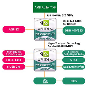 nForce2 晶片組是AMD AthlonXP平台中,唯一提供雙通道記憶體架構(Dual Channel DDR)的晶片組。整體雙通道可支援最高速的DDR400 記憶體,所提供的記憶體頻寬因而高達每秒6.4GB,對整體效能的提昇將有明顯的助益。