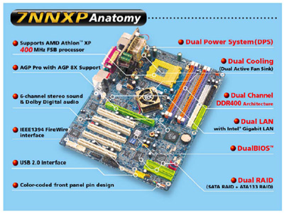 GA-7NNXP 以NVIDIA nForce2 Ultra 400 SystemPlatform Processor(SPP)北橋晶片為核心,支援最新的FSB 400MHz的AMD AthlonXP 處理器,和CPU之間的傳輸頻寬每秒高達3.2GB。它同時支援AGP 8X繪圖介面,以及雙通道DDR記憶體架構(Dual Channel DDR),記憶體與北橋之間最大頻寬可達每秒6.4GB。在南橋方面, GA-7NNXP選用功能完善的nForce2 MCP-T( Media andCommunication Processor-Turbo), 擁有高品質杜比數位音效,二組乙太網路功能、USB2.0、IEEE1394以及ATA133介面。