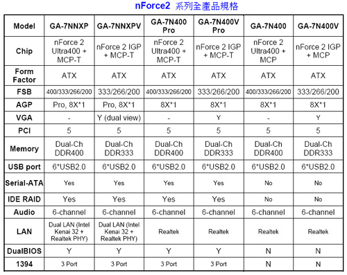 為能滿足不同市場區隔和不同應用範圍的需求,技嘉科技針對NVIDIA nForce2 晶片提供了完整的產品線。除了旗艦級的 GA-7NNXP 以外,GA-7NNXPV、GA-7N400 Pro、GA-7N400V Pro、GA-7N400、及GA-7N400V等提供高階和主流市場AMD 平台的不同產品。具備優異性能及強大功能的nForce2 全系列的產品,將是今年度AMD AthlonTM XP 平台的最佳選擇。
