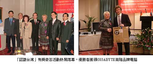 「認識台灣」有獎徵答活動自8月底熱烈開跑後,在俄羅斯各地民眾踴躍參與之下,至10月中收件截止時,有近數百名的民眾參與活動,包含俄國莫斯科市、莫斯科省、聖彼得堡市、薩馬拉、列貝茲、卡路佳等省,甚至遠自白俄羅斯、烏克蘭、立陶宛的俄國僑民熱烈參與,角逐10個優勝獎項;更嚴謹的邀請俄國「勞動報」、「獨立報」、「商人報」、「俄羅斯之聲」等5位深刻瞭解台灣的媒體人士擔綱評審工作,由於題目的高難度以及評審專業的審核方式,使得活動更增添激烈緊張的氣氛。11月初評選揭曉,在當地頗富盛名的馬里奧特酒店進行頒獎,當日有多名優勝者興奮地提到:「很高興能獲得肯定!未來會使用GIGABYTE電腦悠遊全世界!」