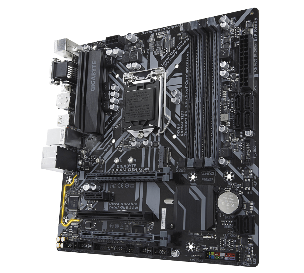 Intel B360 Ultra Durable motherboard with USB 3.1 Gen2 Type-A, Intel GbE LAN with 25KV protection, PCIe Gen3 x4 M.2, 7 colors RGB LED strips support, Anti-Sulfur Resistor, Smart Fan5, DualBIOS™, CEC 2019 ready