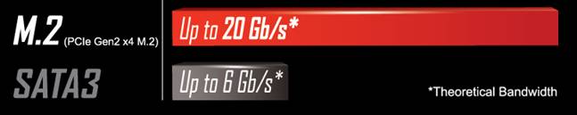 GIGABYTE M.2 solution offers considerably faster storage performance and support for both PCIe and SATA interfaces for M.2 SSD devices. Using PCIe Gen.2 x4 lanes, the onboard M.2 can deliver up to 20Gb/s of bandwidth, more than 3 times faster than SATA3. With this added bandwidth, M.2 storage devices are ideal to install your PC operating system and frequently used programs or data for fast boot-up times and the best responsiveness.