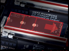 GIGABYTE presents its latest innovation within its Ultra Durable technologies with the PCIe One Piece Metal Shield. Add-in cards can be extremely heavy, especially long graphics cards, and removing them can put a lot of stress on the connector. The innovative one-piece stainless steel shielding design from GIGABYTE reinforces the PCIe connectors to provide the extra strength required to support heavy graphics cards.