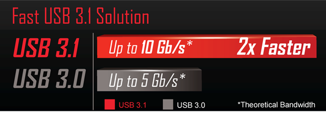 The latest USB 3.1 Gen.2 offers transfer speeds of up to 10 Gb/s. With twice the bandwidth compared to its previous generation and backwards compatibility with USB 2.0 as well as 3.0, USB 3.1 is available via USB Standard-A and the reversible USB Type-C™ making GIGABYTE the best USB 3.1 solution on the market with better compatibility over a wider range of devices.