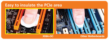 GIGABYTE has listened closely to the overclocking community to make sure the X58A-OC has all of the overclocking features enthusiasts have been asking for, without some of the features that are unnecessary while overclocking, or can negatively impact performance - similar to a stripped down sports car where the aircon, radio, passenger seats, etc… have been removed to reduce weight. Layout was a critical aspect of the design, not only in choice of components used, but also spacing of the components so that insulation of the board is as easy as possible, while still maintaining the most efficient data pathways between the various components. GIGABYTE is also introducing 5 new main overclocking features on the X58A-OC that help to push the performance envelope of the X58A-OC even further including OC-VRM, OC-Touch, OC-PEG, OC-Cool and OC-DualBIOS™.