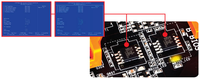 OC-DualBIOS™ features an onboard BIOS switcher and LED indicator, allowing users to select one BIOS for normal use, and another one for overclocking. It can also act as a backup BIOS in case of BIOS failure during overclocking. With two BIOSes, users are able to save up to 16 different overclocking profiles – a very useful feature when overclockers want to update to a new BIOS, but don't want to lose their original settings.