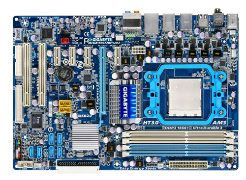 La GA-MA770T-UD3 introduce la revolucionaría tecnología Ultra Durable 3 de GIGABYTE en una plataforma AMD con sus 2 onzas de cobre en el PCB ayudando a reducir la temperatura del sistema y mejorando el rendimiento. Basada en el nuevo chipset 770 de AMD que soporta el nuevo procesador AM3 Phenom II /Athlon II de 45nm con cuatro núcleos de AMD con soporte para la nueva plataforma AM3, un controlador de memoria para DDR3, y tecnología HyperTransport™ 3.0 y la interfaz PCI Express 2.0. Con la innovadora tecnología Easy Energy Saver , la GA-MA770T-UD3 de GIGABYTE es capaz de ofrecer un computo amigable, alcanzar el máximo rendimiento con facilidad y aun así ahorrar energía en tiempo real.